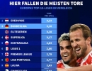 本季欧洲各顶级联赛场均进球榜:德甲3.18球