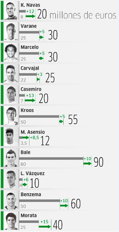 球员升值方面,纳瓦斯因为上赛季表现出色,身价从800万欧元上涨到2000万欧元;替补球员亚涅斯身价不变,仍然只有30万欧元;瓦拉内从2500万欧元上涨到3000万欧元;马塞洛从2500万欧元上涨到3000万欧元;卡瓦哈尔从2200万欧元上涨到2500万欧元;卡塞米罗身价涨幅很大,从700万欧元上涨到2000万欧元;克洛斯也从5000万欧元上涨到5500万欧元;阿森西奥从350万欧元涨价到1200万欧元;贝尔从8000万欧元涨到9000万欧元;巴斯克斯从400万涨到1000万欧元;本泽马从5000万欧上涨到6000万欧;莫拉塔从2500万欧涨到4000万欧元。