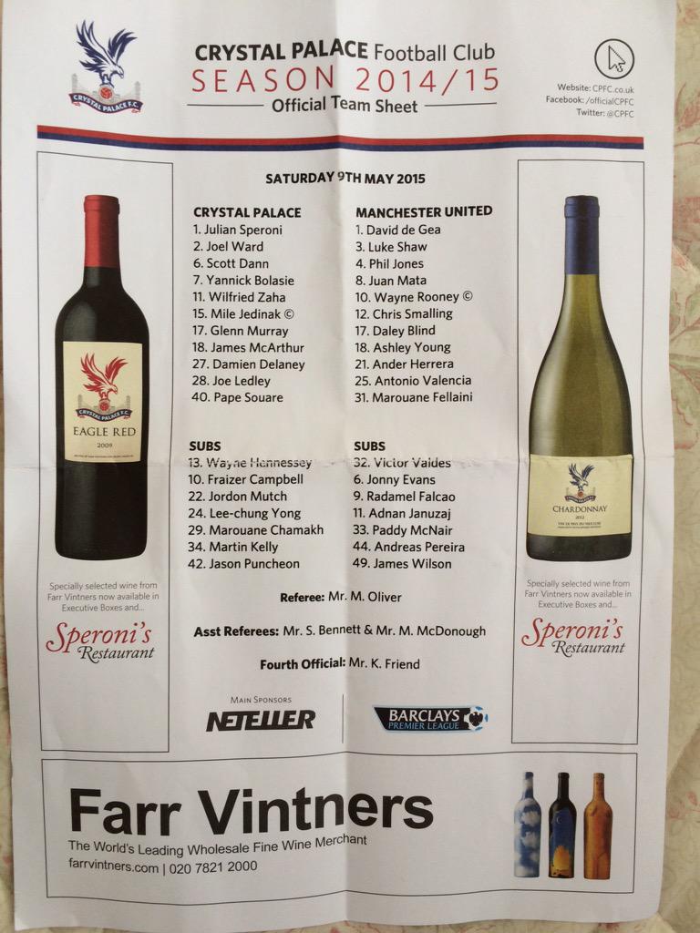大家都错怪范加尔了。其实 Farr Vintners 这家酒商是水晶宫的赞助商,而那张不是宣传单张,而是今场比赛的出场名单,大家见到的红酒只是Farr Vintners在出场名单上的广告。